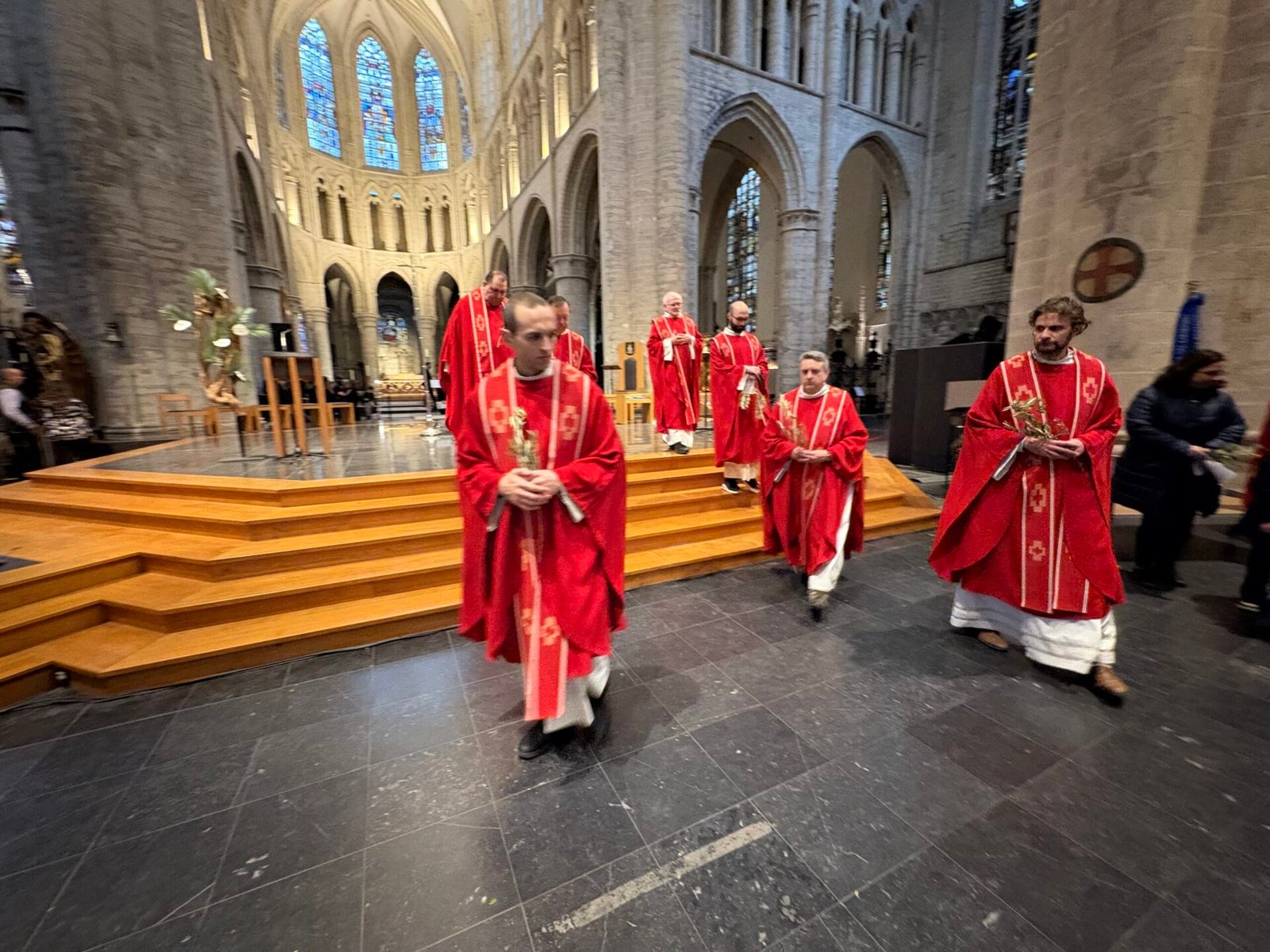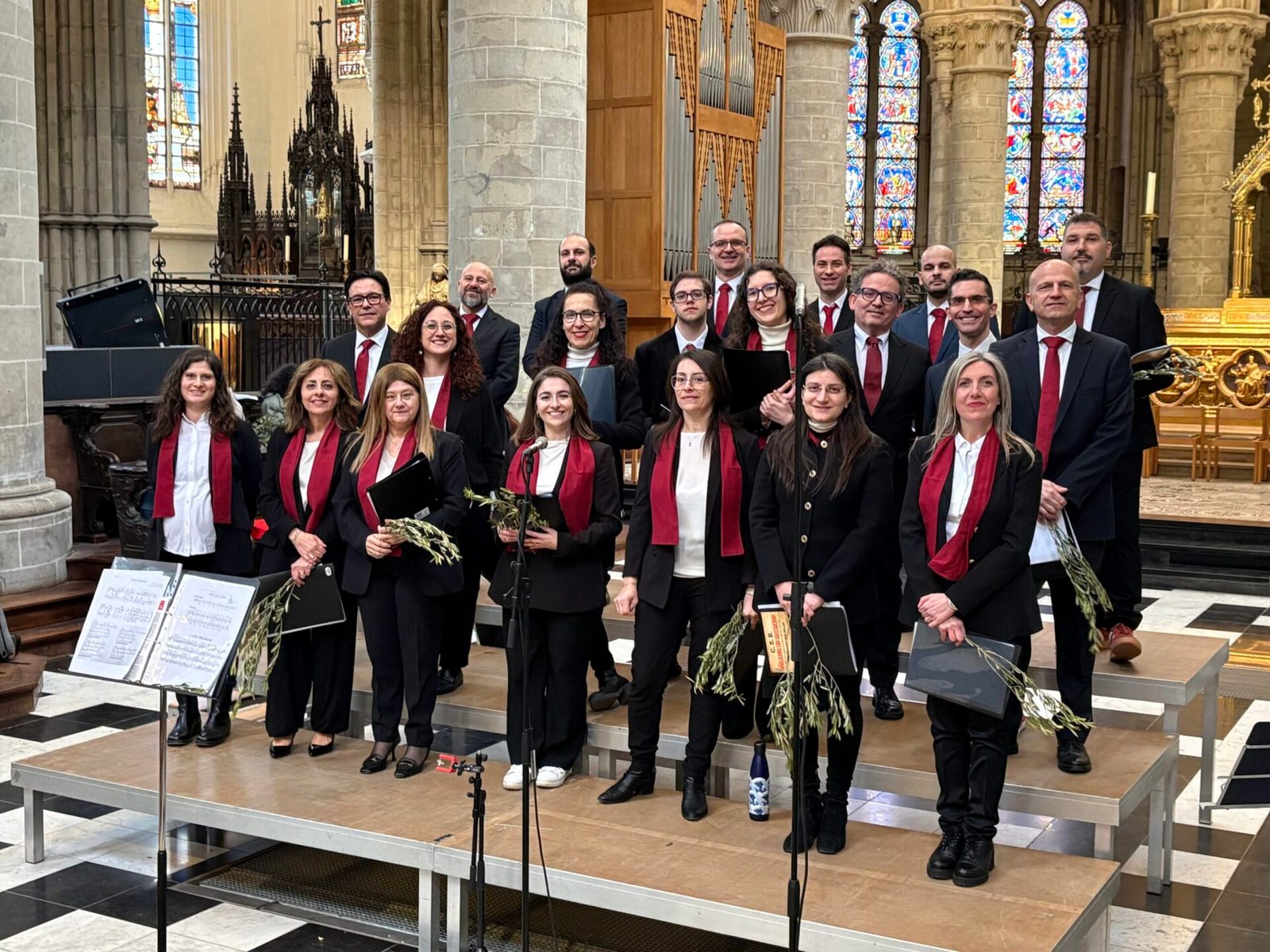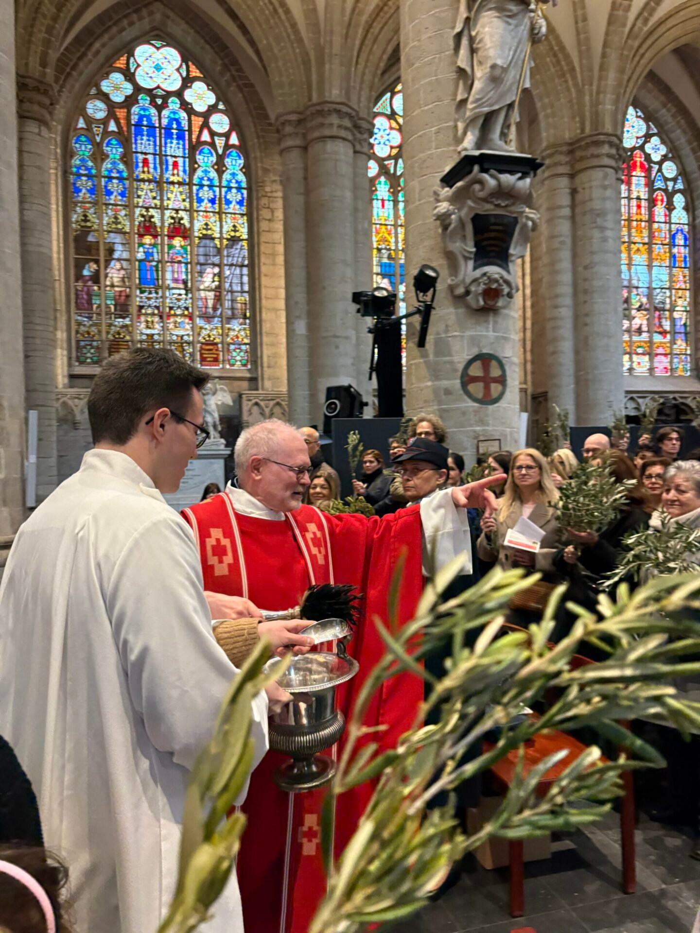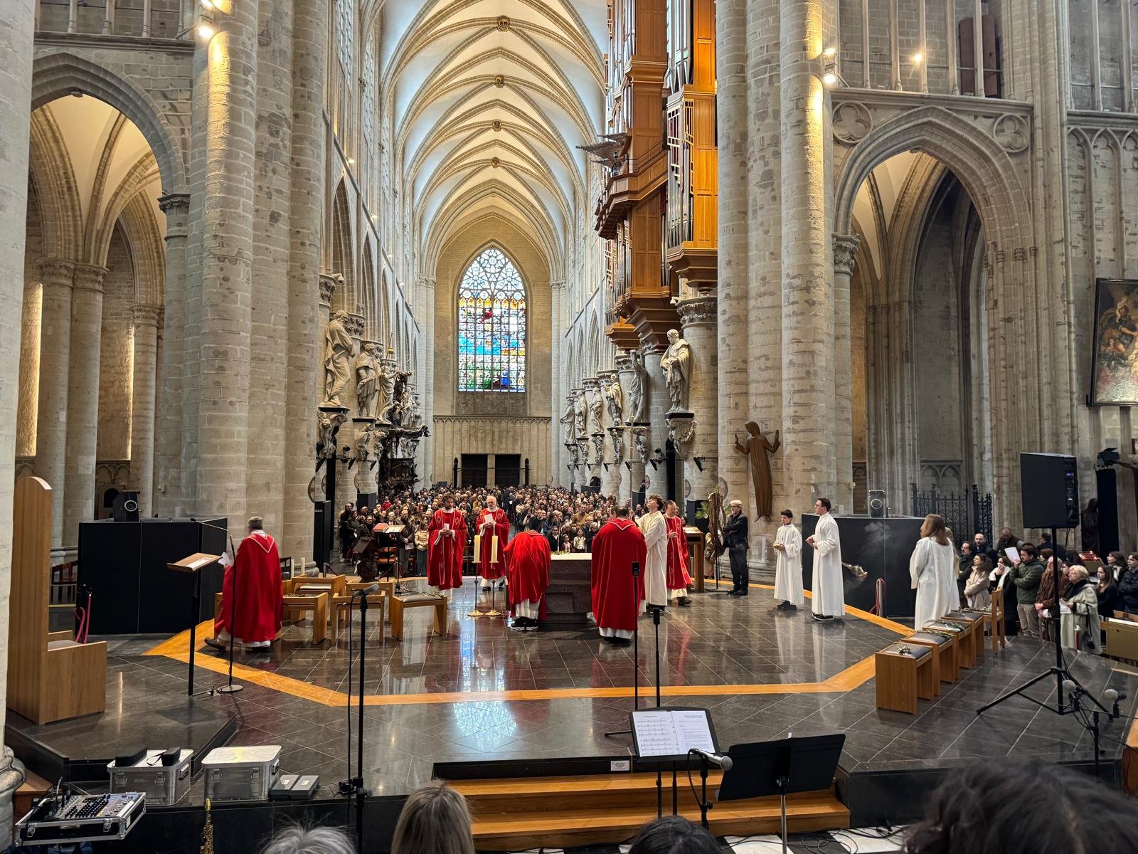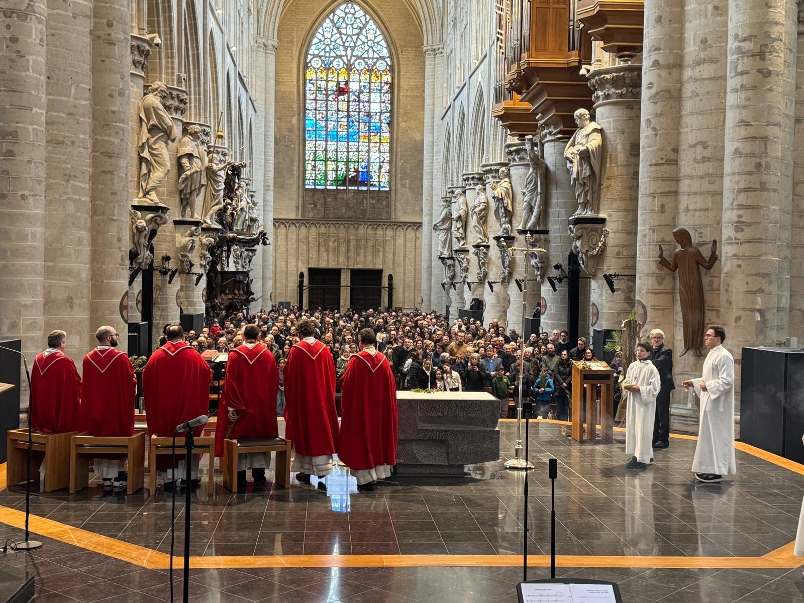 Tenant le symbole biblique de la paix, des branches d’olivier arrivèrent pour l’occasion par un bienfaiteur venu de Sicile, plus de 1200 personnes se réunirent et se réunirent dans la cathédrale de Bruxelles le dimanche des Rameaux ; la communauté italienne se réunit ainsi pour célébrer ensemble la mémoire de l’entrée de Jésus à Jérusalem. La liturgie fut présidée par le père Claudio Visconti, coordinateur du soin pastoral italien du diocèse de Bruxelles, avec six autres prêtres, dont le vicaire épiscopal Eric Vancraeynest.