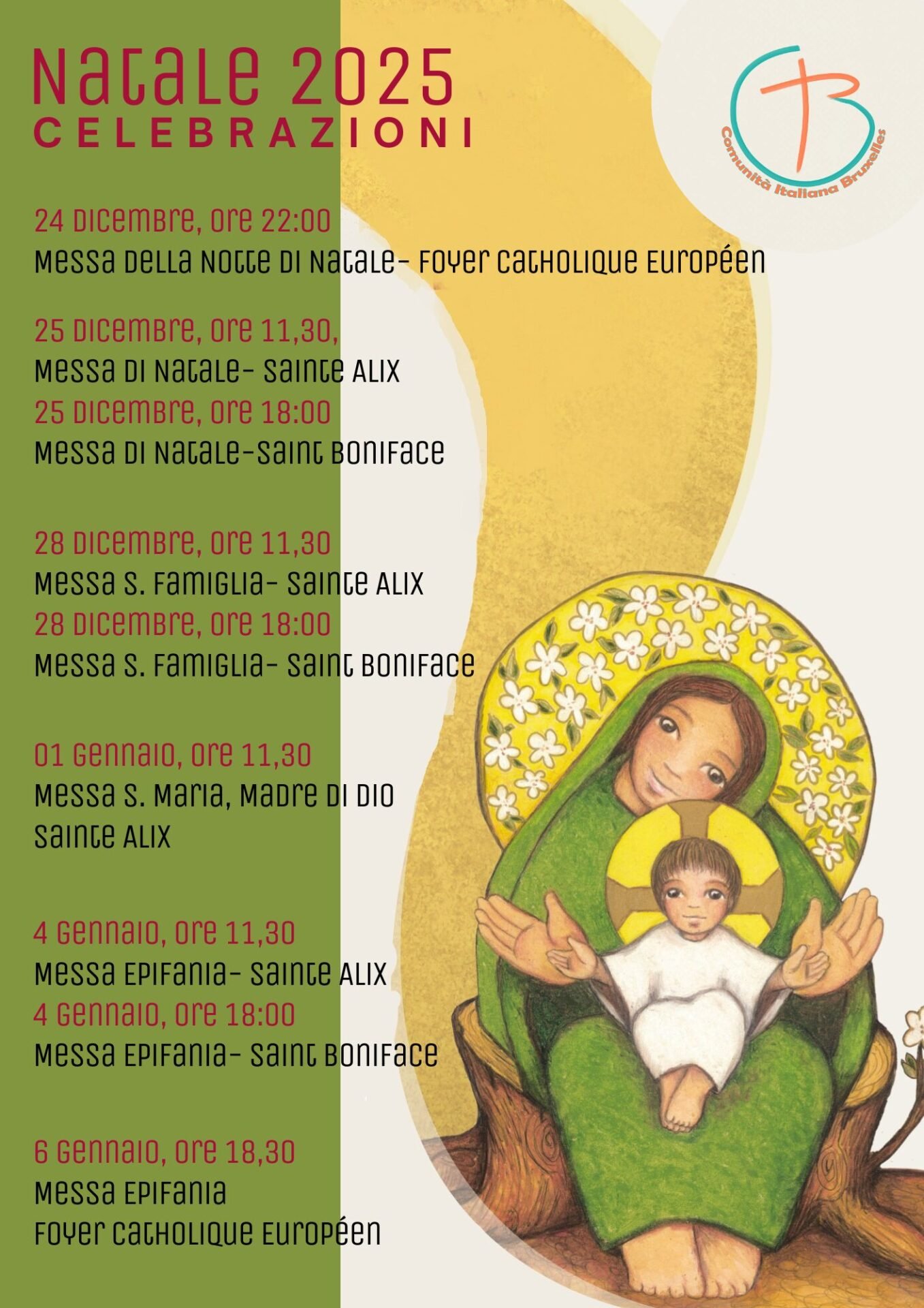 Accueil Événements - Foyer Catholique Européen Événements FCE Pastorale italienne Spiritualité Calendrier des célébrations pendant la période de Noël Calendrier des célébrations pendant la période de Noël + Ajouter à mon Agenda Google + iCal / Outlook export Étiquettes : bruxelles, claudio visconti, don claudio visconti, Natale, pastoraleitaliana Date 04 Jan 2026 Heure 18:00 Lieu Foyer Catholique Européen Rue du Cornet, 51 Bruxelles Autres lieux Église Saint-Boniface Rue de la Paix 21 1050 Ixelles, Belgique Église Saint-Boniface Église Sainte Alix Parvis Sainte-Alix 1150 Woluwé-Saint-Pierre Prochain événement Les Crèches à la Cathédrale des Saints-Michel-et-Gudule Date 04 Jan 2026 Heure 09:00 - 18:00 Partagez cet événement